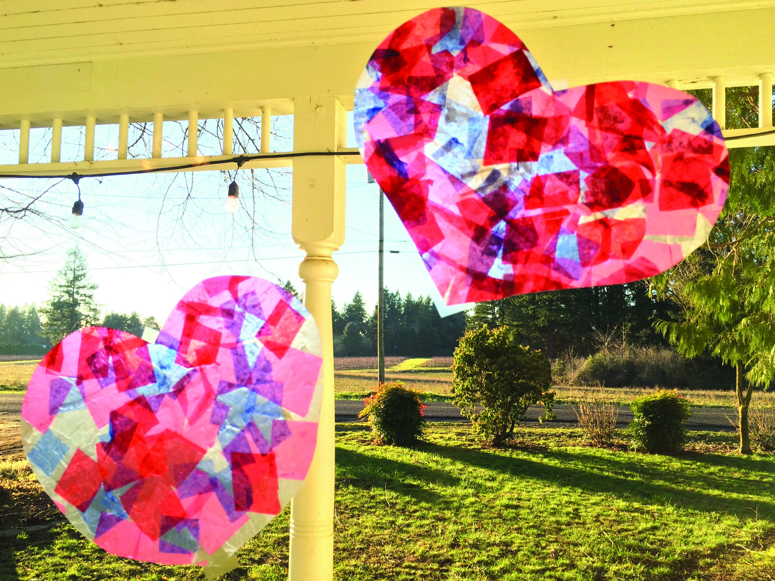 Cut tissue paper scraps into one-inch squares. Use a variety of colors. Don’t forget red, pink, and white. Cut the edges off one plastic sheet protector and split it into two sheets. Spread one sheet for each heart with a thin coat of Mod Podge. Cover the page with overlapping tissue squares, using a bit more Mod Podge, as needed. When you are done putting down tissue, cover the entire page with a thin layer of Mod Podge. Let dry overnight. Bend page in half and cut into one large heart. Sun catchers will last longer if you leave them on the plastic sheet protector and tape them on to sunny windows sheet-side-out with scotch tape.