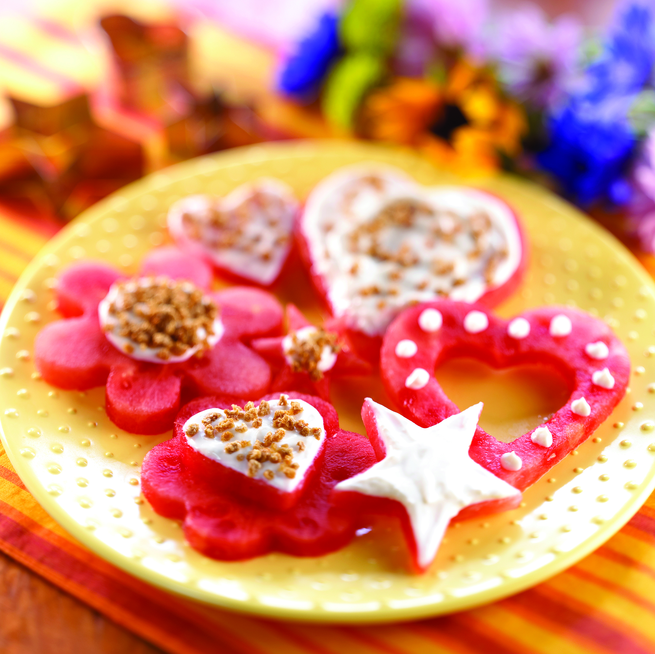 Look for simple recipes kids can help create. Logically, the first step in the process is to focus on ingredients and instructions that aren’t overly complicated. For example, avoid snacks that call for cutting with knives and instead try a recipe like these Frosted Watermelon Cutouts, which involves kid-friendly cookie cutters.
